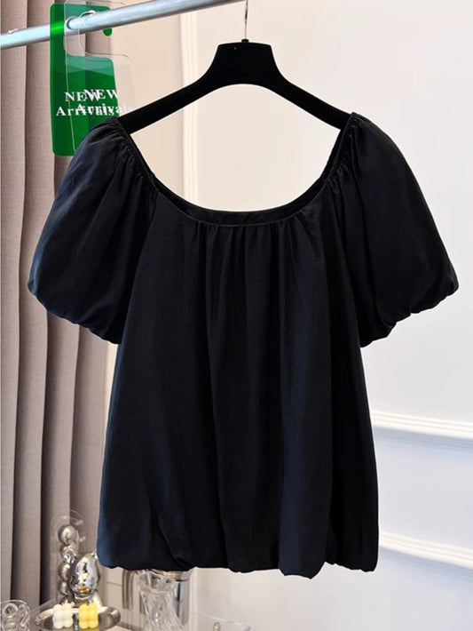 Black bubble-sleeved chiffon short-sleeved shirt women's summer new large-size fat mm belly-covering doll shirt one-word shoulder top