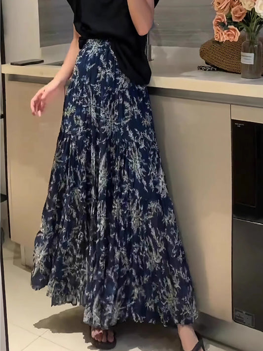 Blue floral design sense fashion temperament skirt women's high waist and thin medium and long skirt spring and summer new 2024