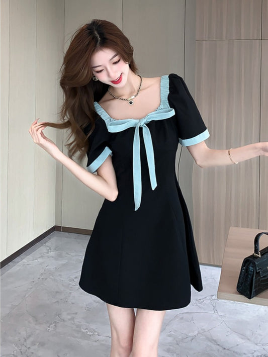 Color matching square neck dress women's 2024 summer new Hepburn style waist thin medium and long A-shaped skirt
