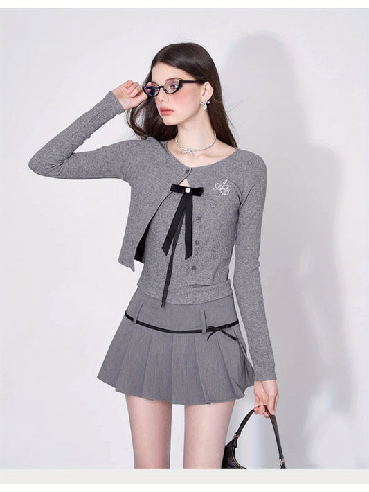 Cold grey hollow bow long-sleeved top women's 2024 autumn new fashionable niche design knitted T-shirt