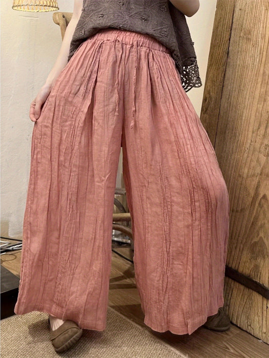2024 summer new retro niche fresh zen versatile elastic waist pleated hemp straight pants
