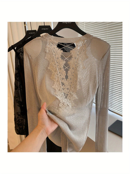2024 summer new Korean version of sexy and thin hollow design round neck T-shirt thin sunscreen shirt top women