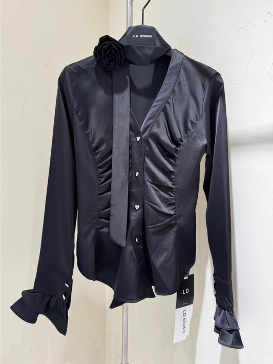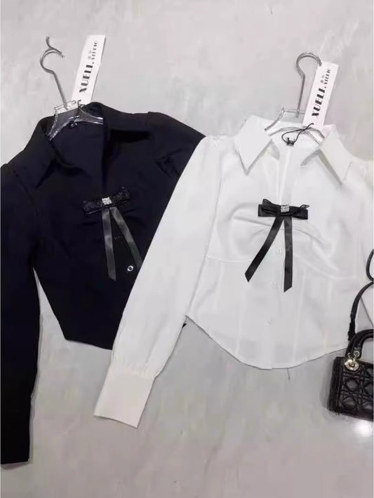 Autumn new Korean version of pure desire wind V-neck bow waist long-sleeved shirt white