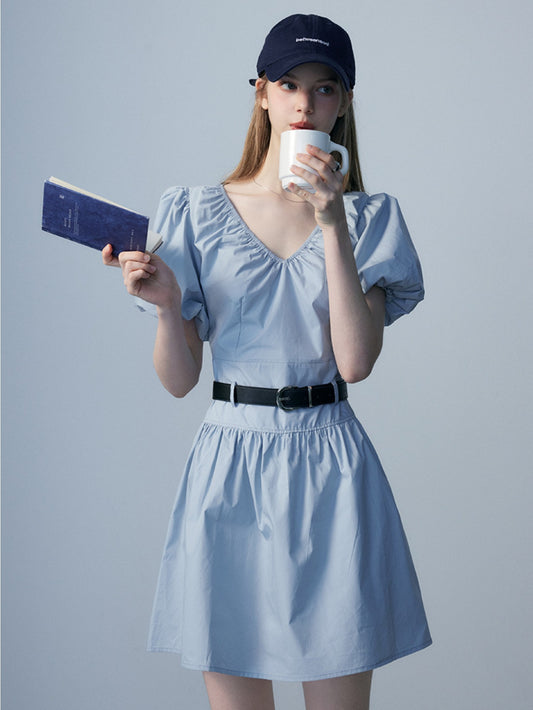 Bubble sleeve V-neck dress women's new waist slim and thin pleated solid color skirt