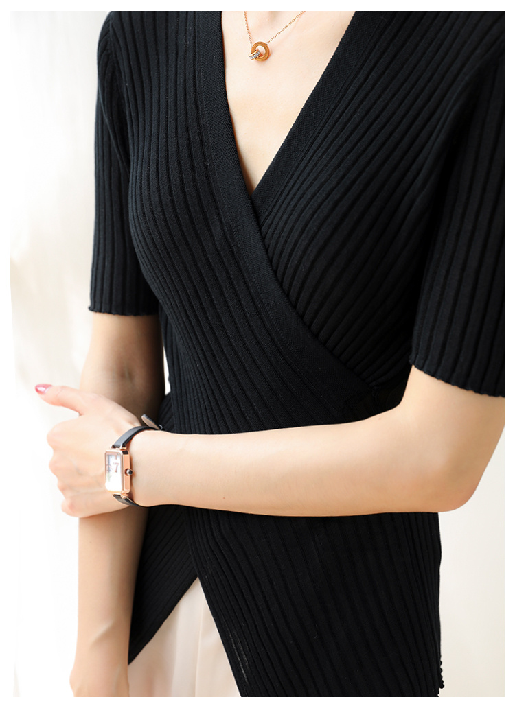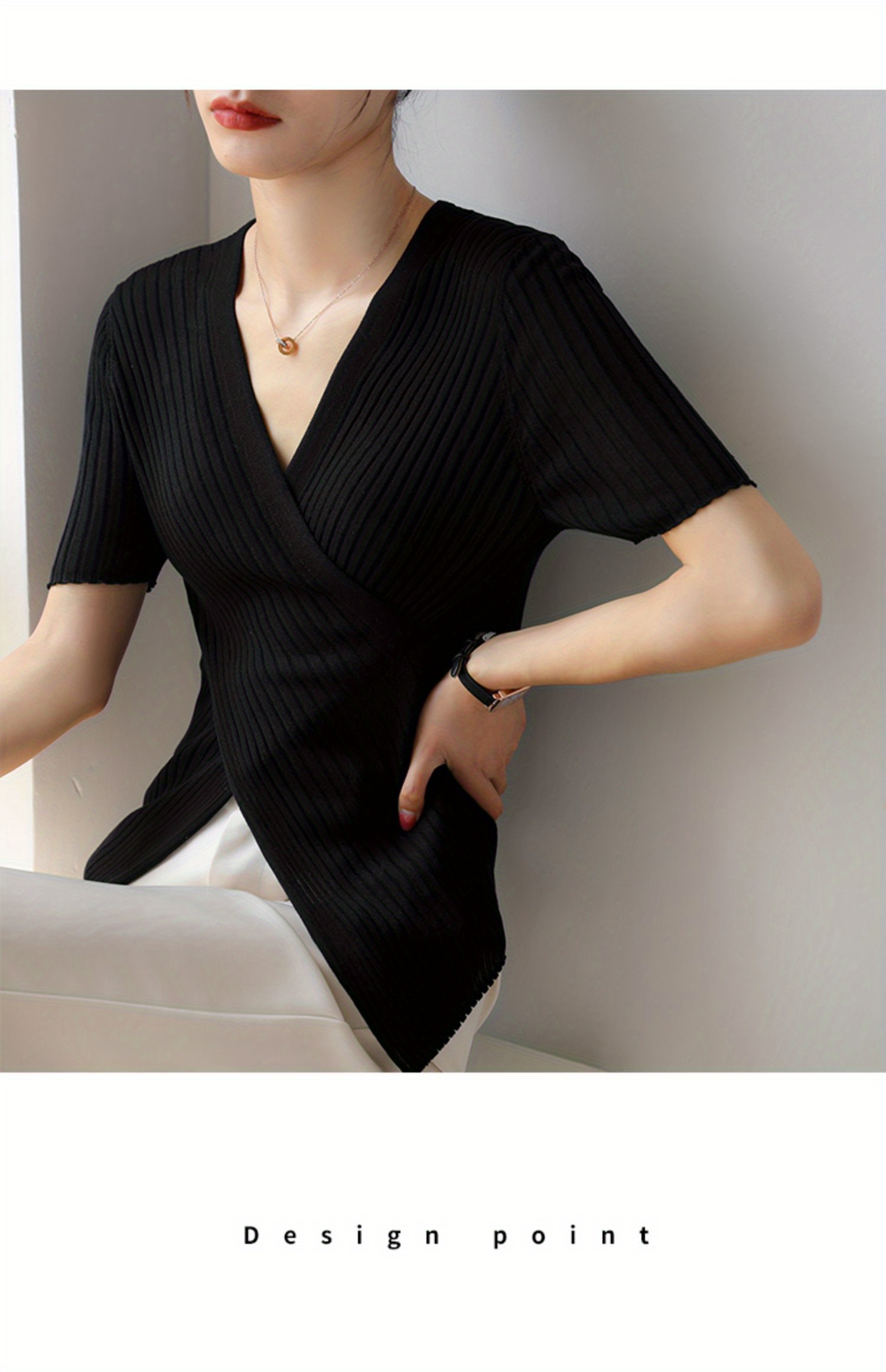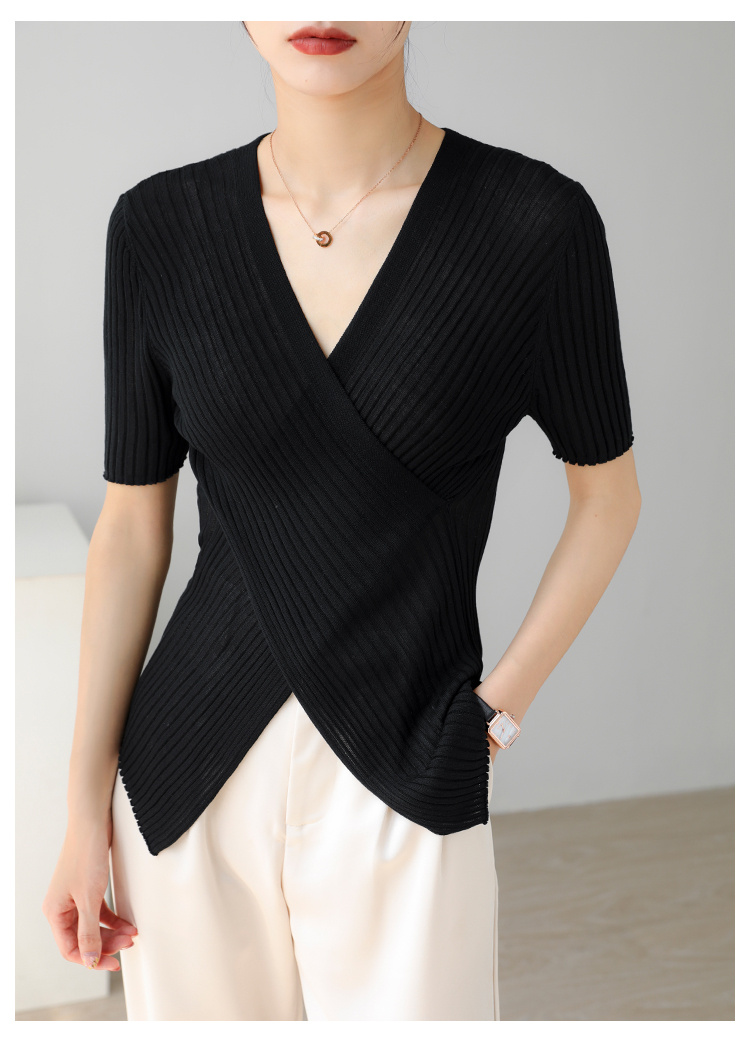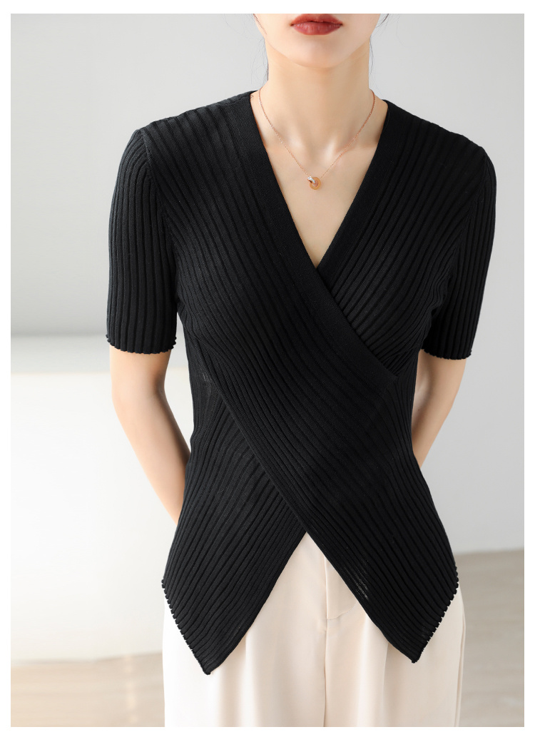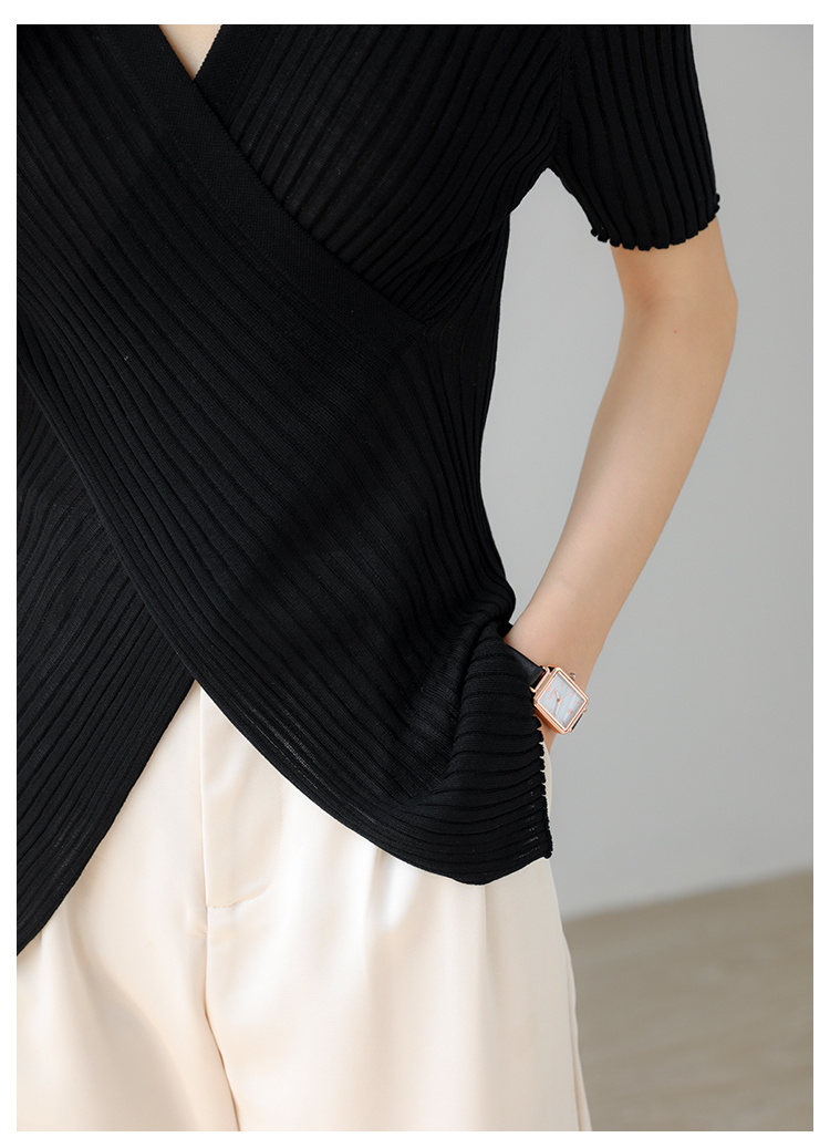 Design sense niche ice silk short-sleeved T-shirt women's summer thin black V-neck high-end sense knitted irregular cross top