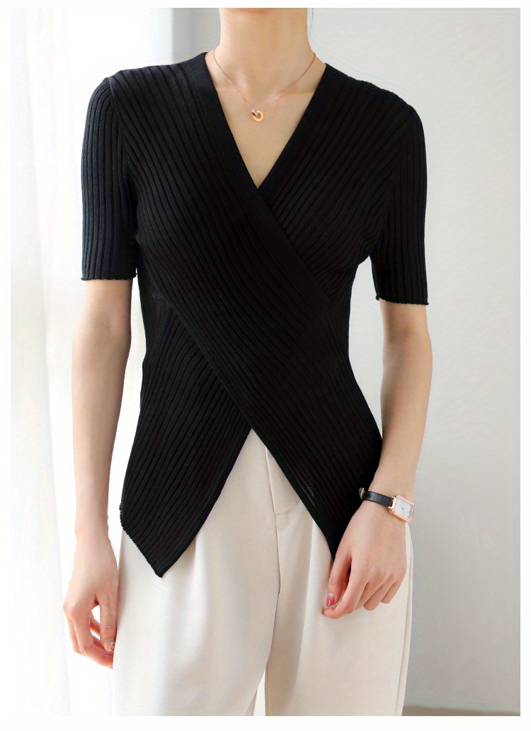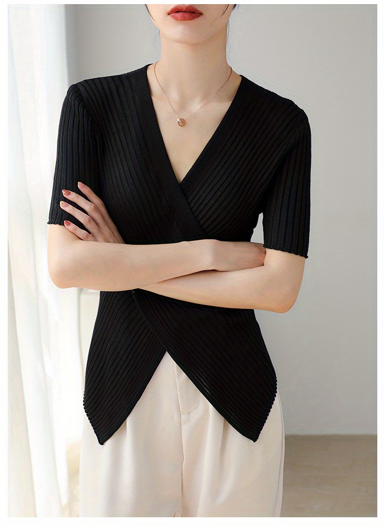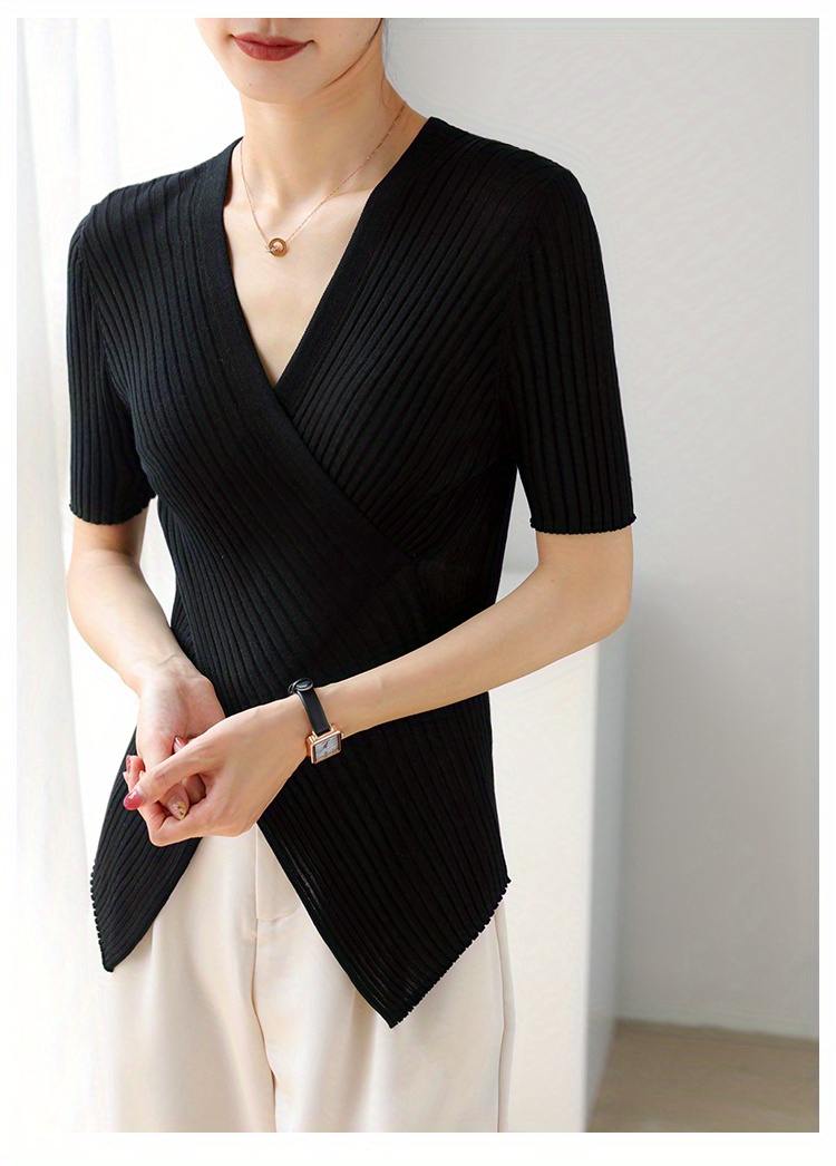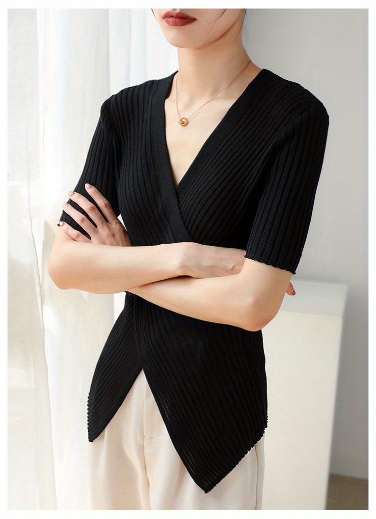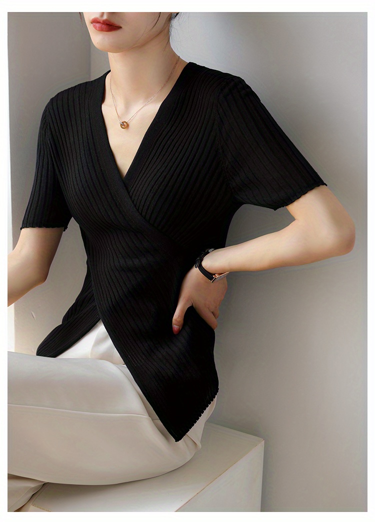 Design sense niche ice silk short-sleeved T-shirt women's summer thin black V-neck high-end sense knitted irregular cross top