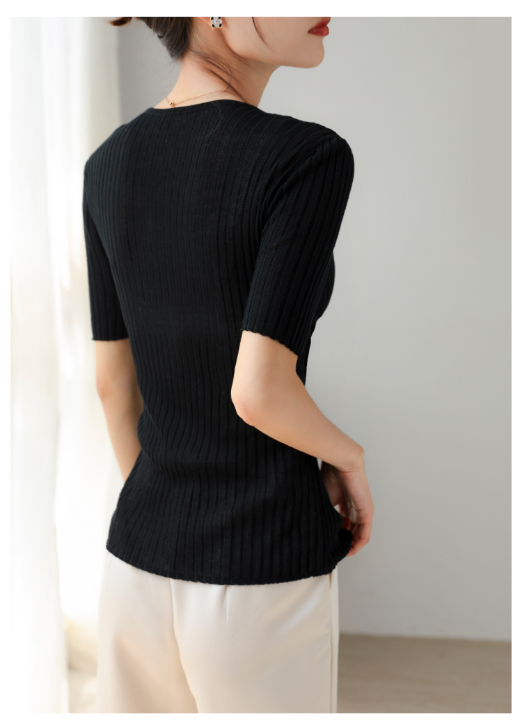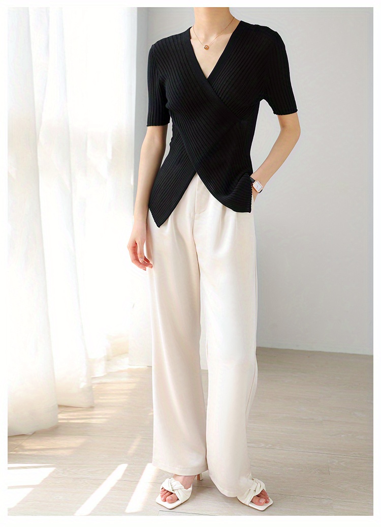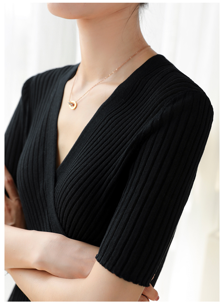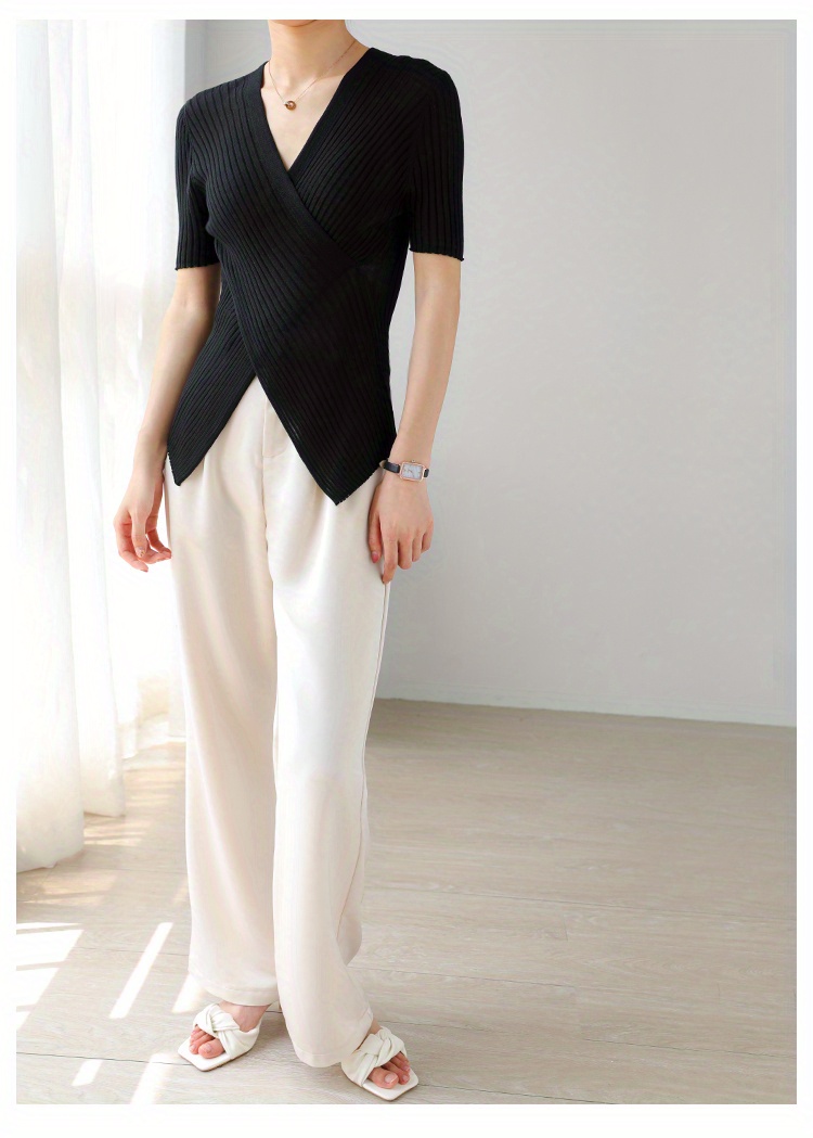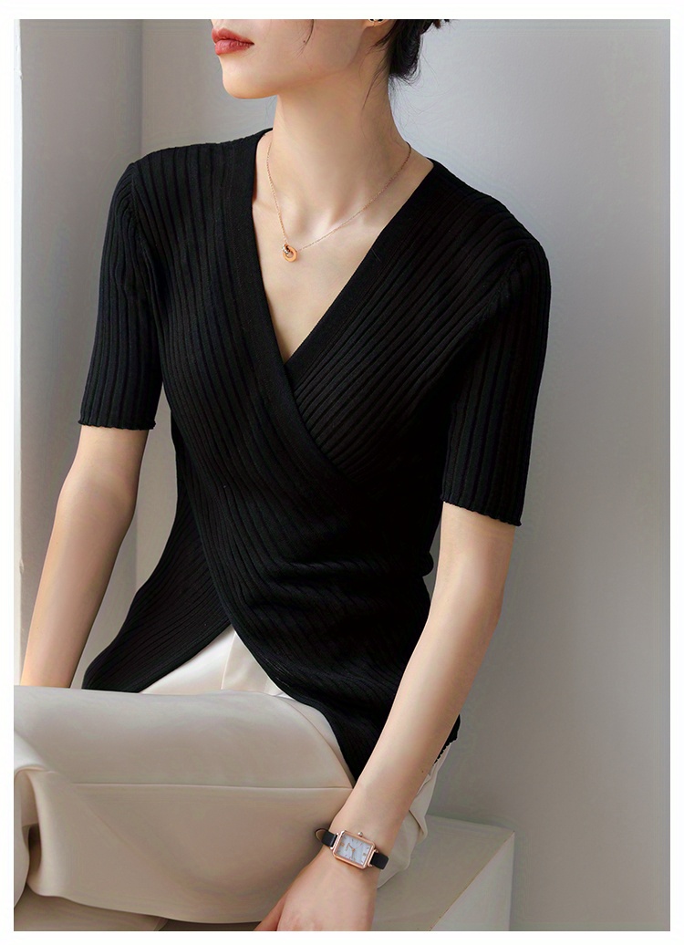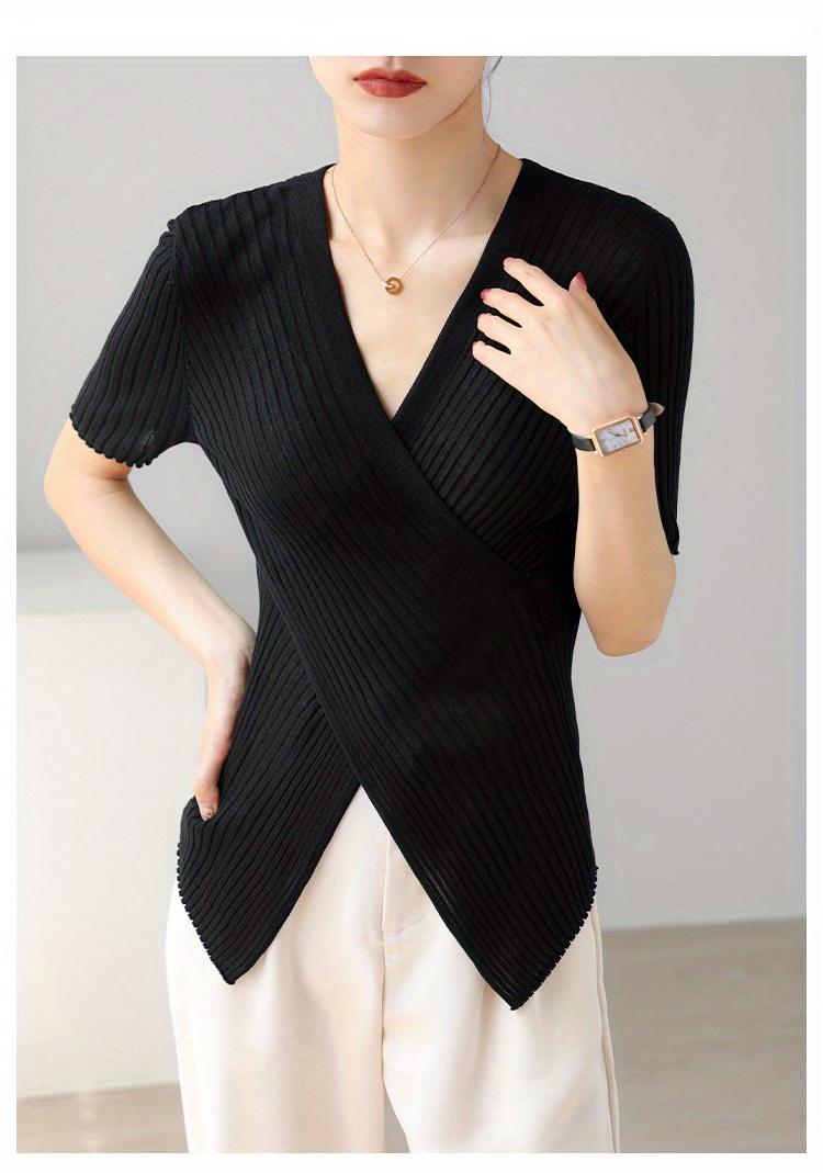 Design sense niche ice silk short-sleeved T-shirt women's summer thin black V-neck high-end sense knitted irregular cross top